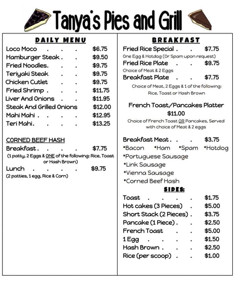 Welcome to Tanya's Pies and Grill, a hidden gem in Wahiawa, Hawaii. Situated at 1008 California Ave, this cozy diner serves up an enticing menu that reflects the rich local flavors of the island. Their breakfast offerings include the popular Fried Rice Special and fluffy Pancakes, perfect to kickstart your day. For lunch, don't miss the savory Loco Moco or the hearty Hamburger Steak, both served with generous portions of rice and veggies.